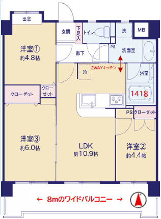 ご家族にも十分な広さの3LDK物件です。こちらの物件は南向きです。バルコニーの広さが11.6