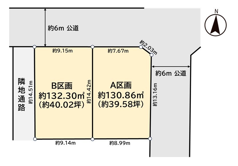 | 接道状況 | 角地 北7.6m 幅員6m 東15.1m 幅員6m |