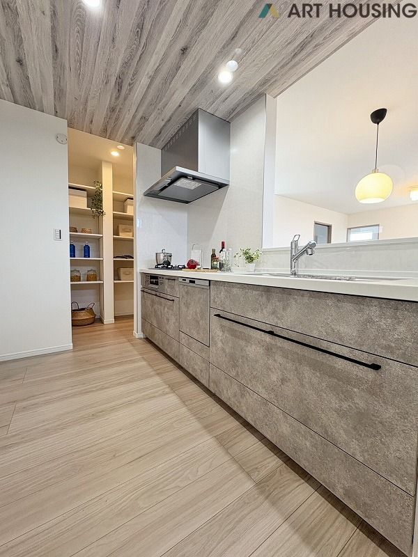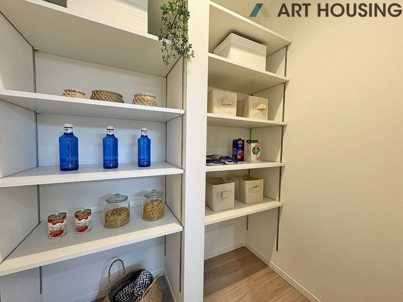 ☆土間のある家☆キッチン横に広々としたパントリーがあり備蓄品のストックに便利!玄関横の4.5帖土間はお子様の遊び場としても、アウトドア用品の収納場としてもお使いいただけます♪