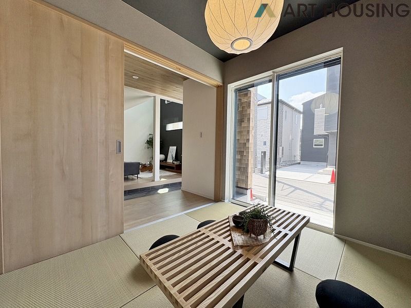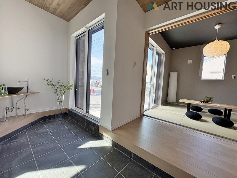 ☆土間のある家☆吹き抜けのあるLDKは明るく開放的!通り土間には洗面スペースが設置されており、外で遊んだあと手洗いが可能☆和室は通り土間の先にあるので空間が分かれており来客にも便利♪