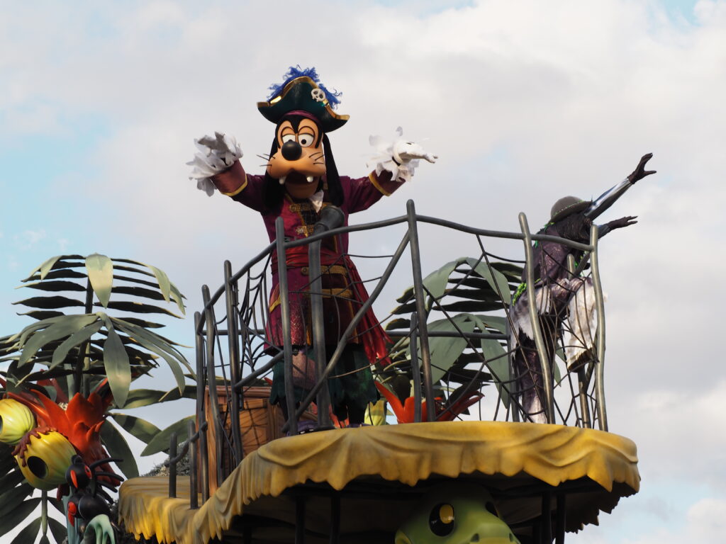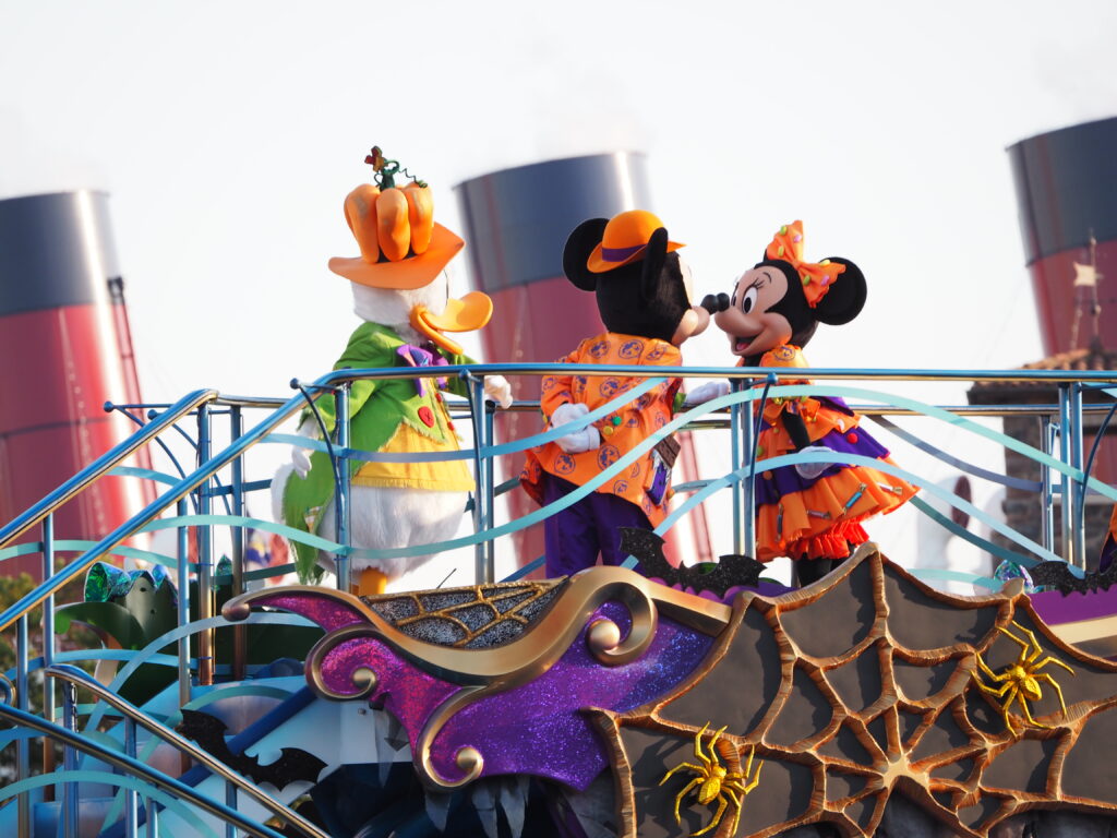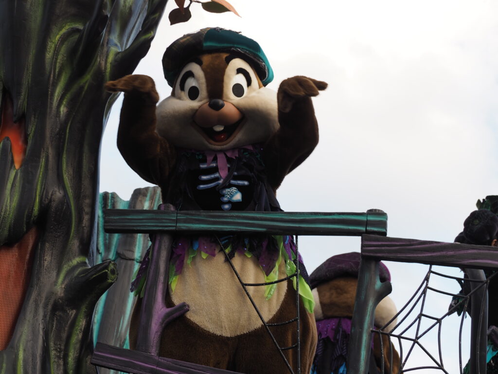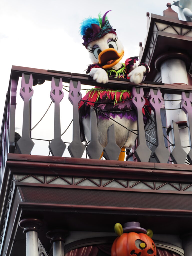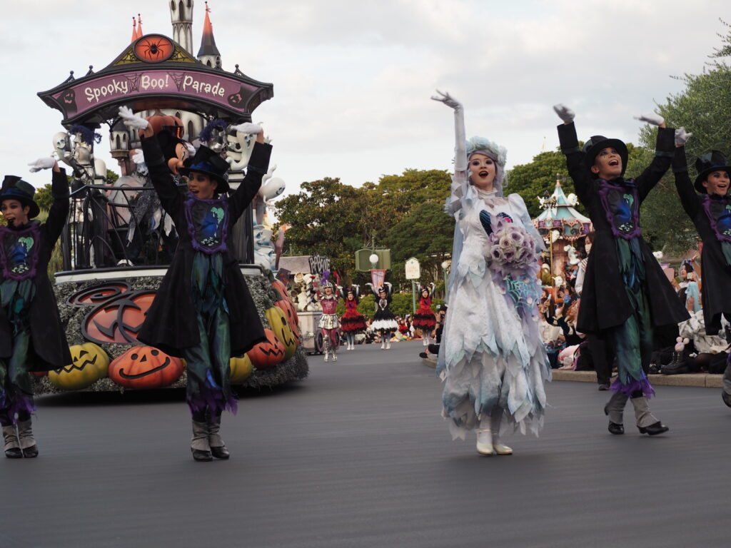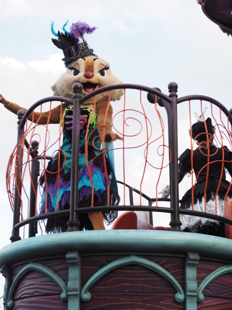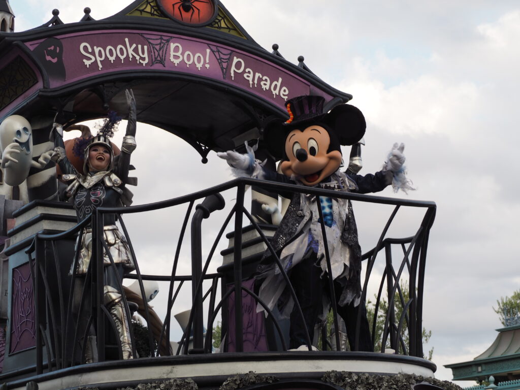 パレード後アトラクションを巡り、軽食を済ませていたらあっという間にスプーキーBoo!パレード開始時間の30分前になり観賞場所へ移動…。DPAという有料で鑑賞場所を確保できるサービスを利用したのですが、最前列で鑑賞できました!
