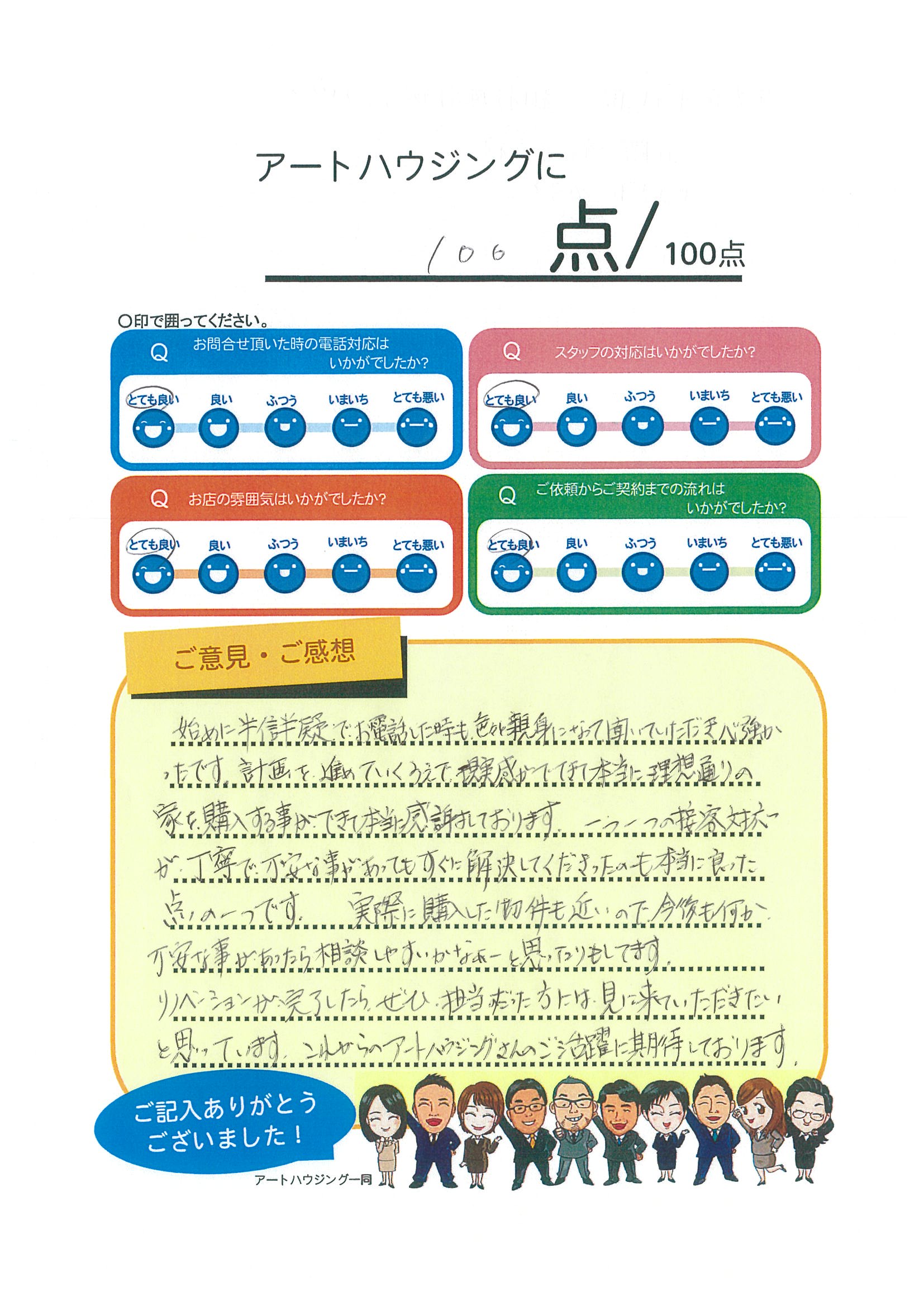 お家探しのお手伝いが少しでもお力添えになれたことを嬉しく思っています。不手際もあったと思いますが、お客様の寛大さに救われました。これからの新生活のご健勝を心より願っています。リフォームが完成するのがとても楽しみです。ぜひご入居まで見届けさせてください。
