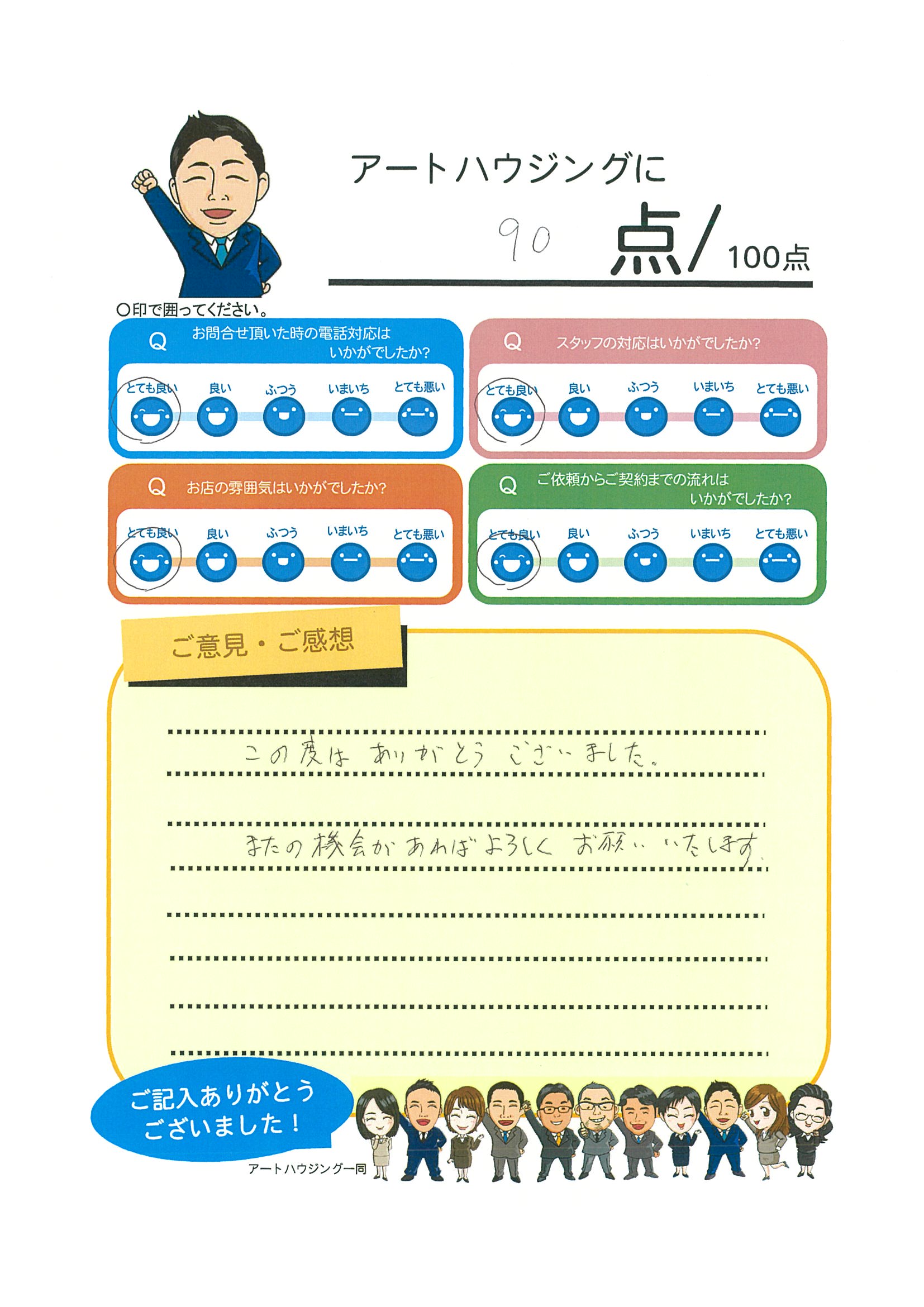 この度は不動産の売却のお手伝いをさせていただき有難うございました。今後も何かご相談などございましたらいつでもお声がけください。